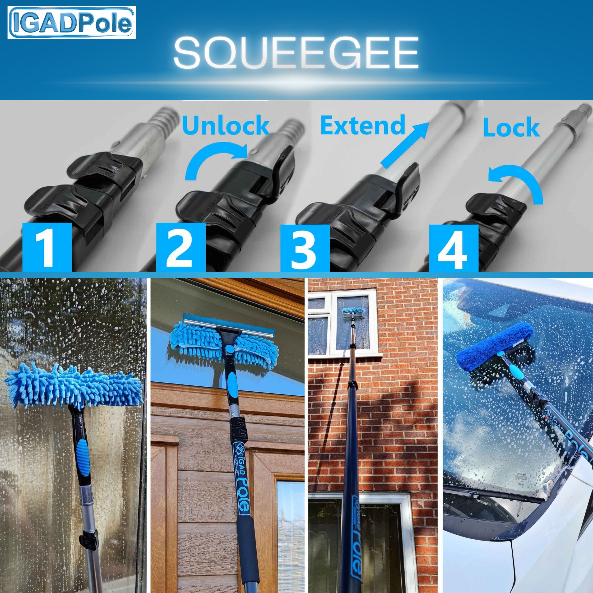 - Professional Window Cleaning Kit – Our window washing kit with extension pole is ideal for homeowners and small businesses. This high window cleaning kit with pole includes a 10”(25cm) squeegee, 2 additional Replacement Blades, as well as 2x Machine-Washable Cloths (1x Chenille & 1x Microfiber) and a 6.6ft(2m) aluminium pole